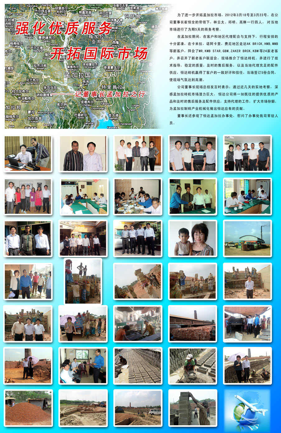 在孟加拉期間,公司得到了當(dāng)?shù)卮砩痰亩αχС,召開了新老客戶聯(lián)誼會(huì),對當(dāng)?shù)厥袌龅拇u瓦行情進(jìn)行深入交流。當(dāng)前孟加拉多半還是手工制磚,而且國家已經(jīng)出臺(tái)了政策,截至2015年取消手工做磚。這對于公司來說是個(gè)很大的機(jī)遇。但同時(shí),競爭也是激烈的,各個(gè)磚機(jī)廠紛紛涌入孟加拉市場,加強(qiáng)對當(dāng)?shù)厥袌龅拈_發(fā),可以說機(jī)遇與挑戰(zhàn)并存的,這就要求公司要嚴(yán)抓產(chǎn)品質(zhì)量,加強(qiáng)售后服務(wù),爭取使我們的機(jī)器遍布孟加拉市場。