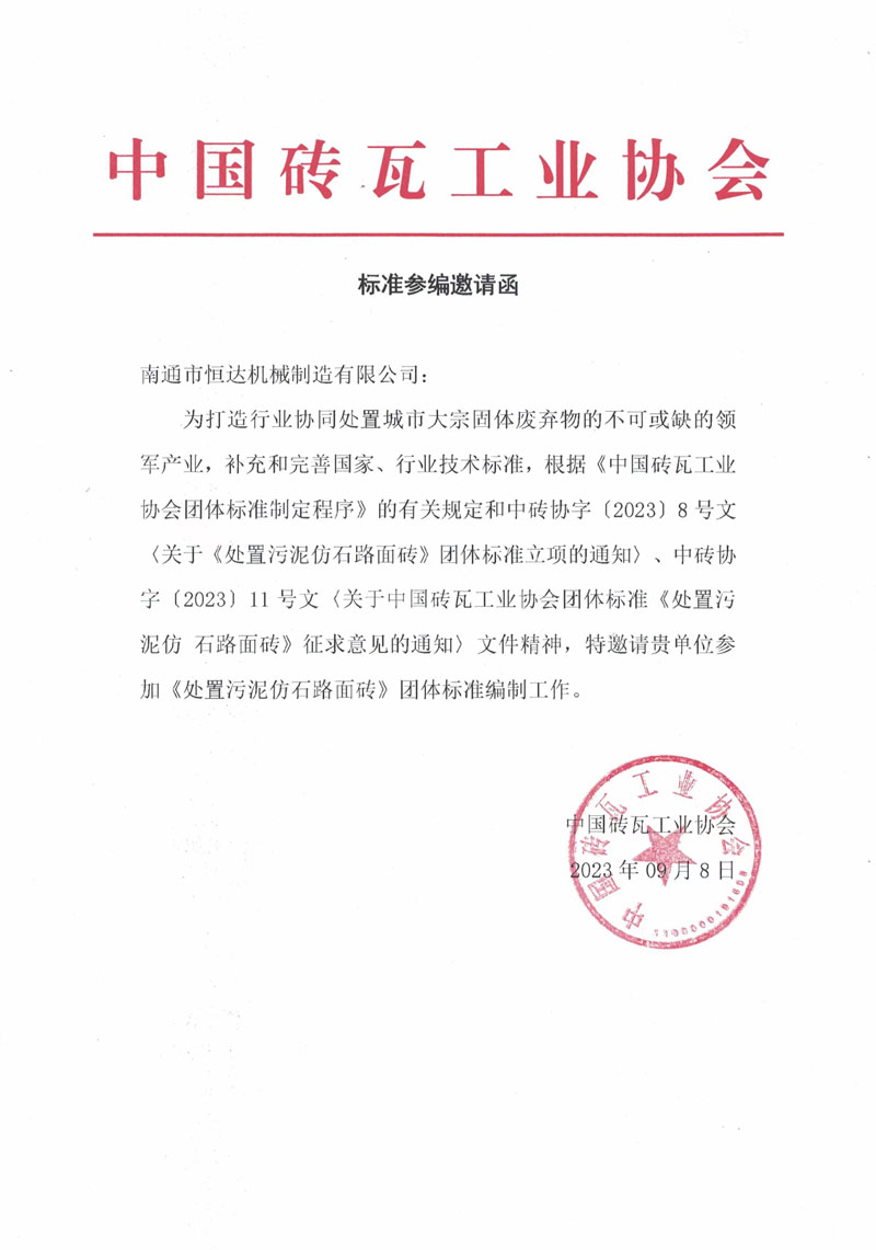行業(yè)要健康發(fā)展,標(biāo)準(zhǔn)必須先行。再此背景下,2023年10月21-22日,在中國杭州,中國磚瓦協(xié)會及時的組織了行業(yè)骨干企業(yè),群策群力,制定高質(zhì)量標(biāo)準(zhǔn)。南通市恒達(dá)機械制造有限公司董事長崔恒全和技術(shù)總工于銀龍受邀請參加,為標(biāo)注的制定貢獻(xiàn)恒達(dá)力量。